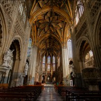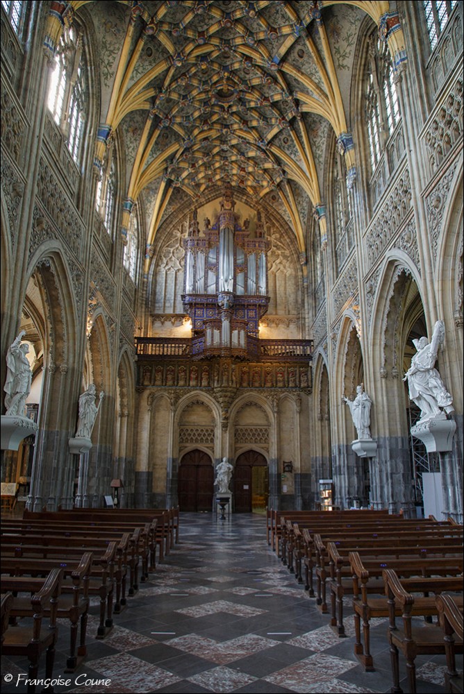 After the concordat of 1801, the collegiate church of Saint-Jacques became a parish church, the main cloister, a park and the demolished abbey buildings were replaced by modern buildings. The current Gothic church, whose construction was completed in 1538, replaced the original Romanesque church. The vault and its paintings are from the same period, as well as the stained glass windows in the choir dating from 1525 to 1531. The Renaissance portal added in 1558 is attributed to Lambert Lombard. The primitive church had a Romanesque front section and an octagonal bell tower dated around 11702. Only the front section with one of its three towers has been preserved. Among the most remarkable elements, the nave, real stone lace; the exceptional vault with more than 150 keystones in the central nave; the 14th century stalls; the Renaissance organ case and its Renaissance-style instrument rebuilt by the Schumacher organ factory in Eupen; the famous stained-glass window with the coats of arms of 32 old trades (16th century); the baroque statues of Del Cour and his school (late 17th century); and the Coronation of the Virgin (sculpted group from the 14th century). The stained-glass windows of Saint-Jacques are considered by some authors to be perhaps the most beautiful in Belgium. The French archaeologist Adolphe Napoléon Didron does not even hesitate to rank them at the top of all those that survive from the 16th century. |